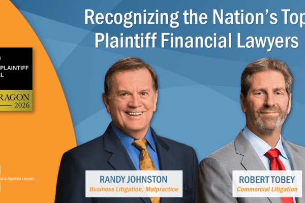 Dallas trial lawyers recognized for taking on complex business disputes and the people who create them DALLAS – Johnston Tobey Baruch shareholders Randy Johnston and Robert Tobey have for the sixth consecutive year earned slots on the Lawdragon 500 Leading Plaintiff Financial Lawyers guide. Lawdragon publishes annual guides for dozens of practice areas and in […]