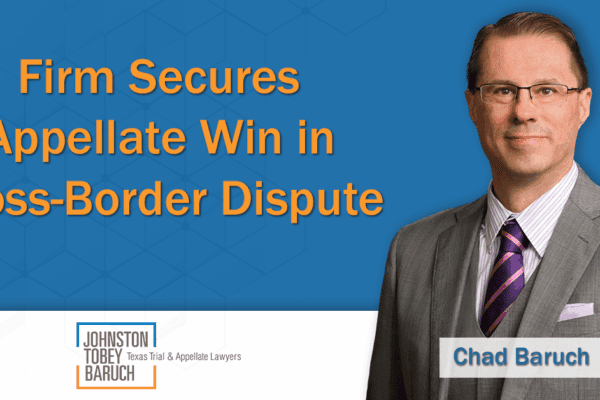 Johnston Tobey Baruch wins key ruling from El Paso appeals court in cross-border res judicata dispute EL PASO, Texas – The 8th Court of Appeals in El Paso has sided with Johnston Tobey Baruch and its client in a civil case involving the interplay of Mexican and Texas preclusion law. The dispute stemmed from a […]