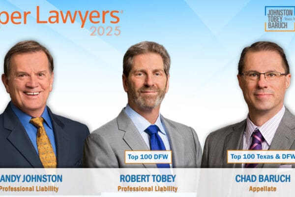 Accolades include two named to elite Top 100 lists DALLAS – Dallas-based trial and appellate firm Johnston Tobey Baruch’s three shareholders Randy Johnston, Robert Tobey and Chad Baruch have been named to the 2025 edition of Texas Super Lawyers. Each year, Super Lawyers identifies no more than 5% of lawyers in Texas for inclusion. “We […]